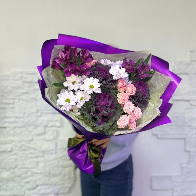 Альстромерия, Брассика, Лента, Пленка, Тишью, Хризантема кустовая Бакарди, роза кустовая