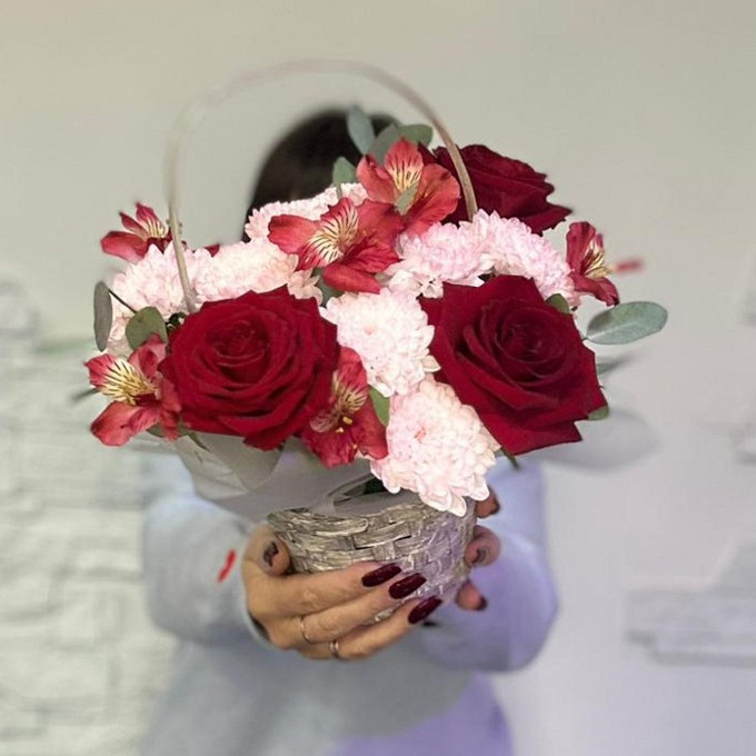 Альстромерия, Пиафлор / оазис/ флор. губка, Пленка, Хризантема кустовая Балтика, Эвкалипт, роза, корзинка плетеная
