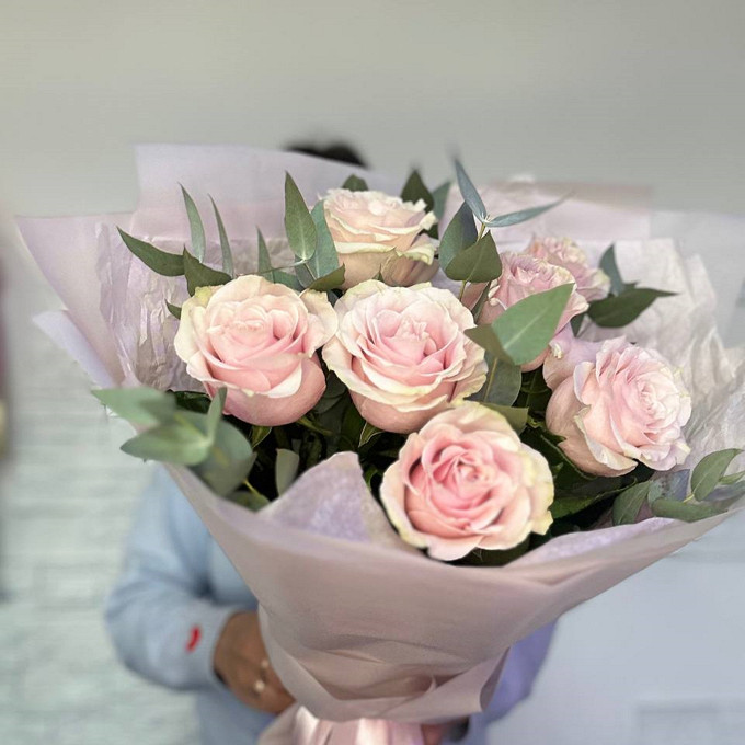 Монобукет из 7 нежных роз Пинк мондиаль с эвкалиптом